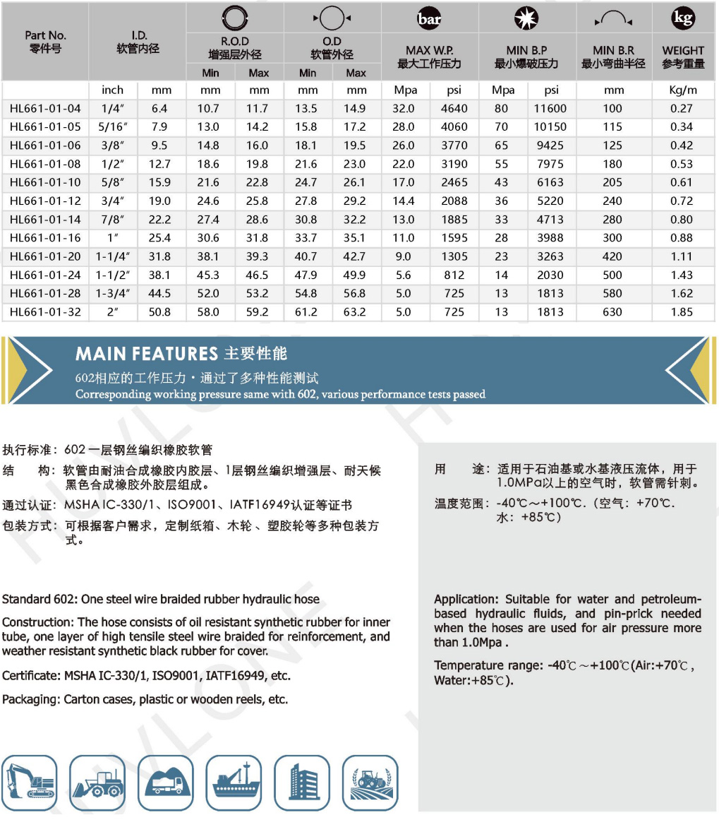 產(chǎn)品用途:適用于石油基或水基液壓流體,用于1.0MPa以上的空氣時(shí),軟管需針刺。