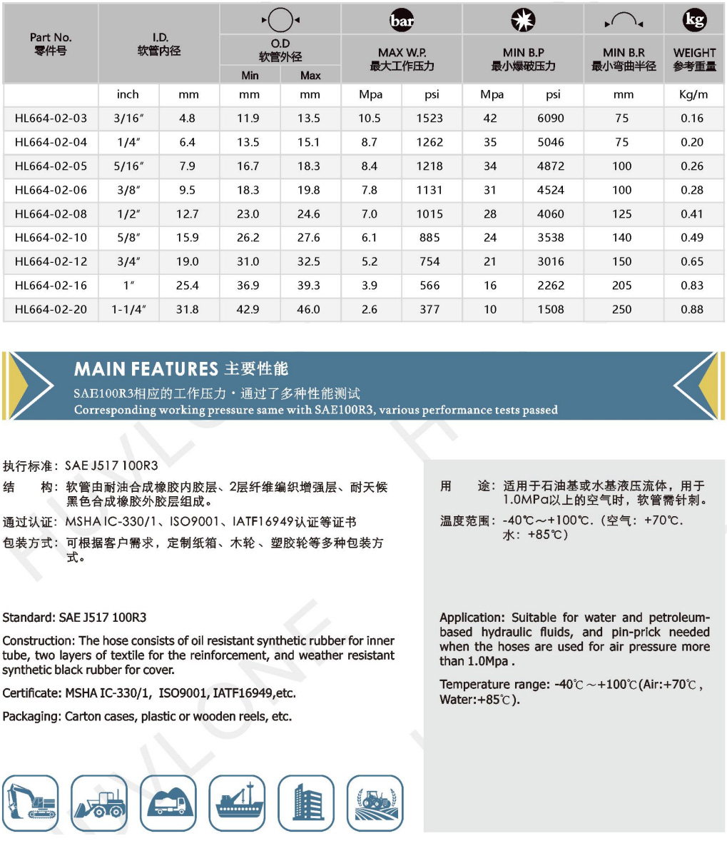 產(chǎn)品用途:適用于石油基或水基液壓流體,用于1.0MPa以上的空氣時(shí),軟管需針刺。