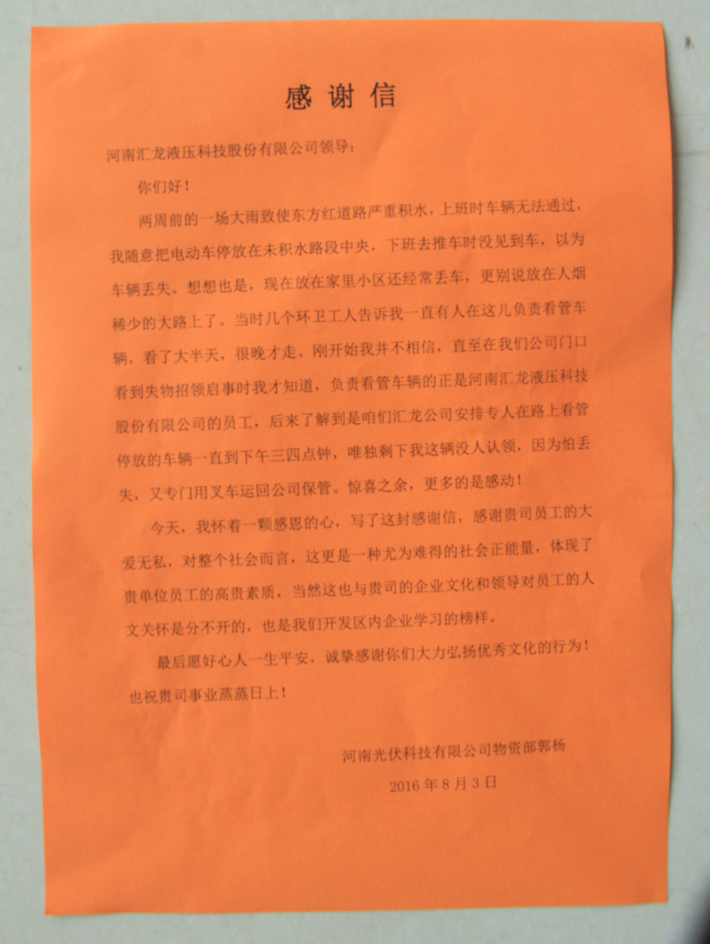 8月2日,協鑫的兩名員工來到我公司認領電動車,電動車主人為協鑫物資部郭楊,郭楊說,她幾乎已經放棄了尋找電動車的希望,并把電動車防盜鎖的鑰匙都給扔了。8月3日上午,我公司設備部員工幫忙將電動車的鎖打開,郭楊高高興興地推走了電動車。下午,郭楊又同協鑫行政部、供應部、采購部的幾名人員前來我公司進行感謝,并帶來了一封感謝信。