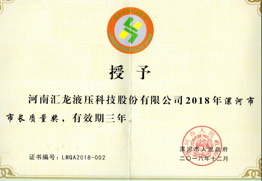 喜獲捷報,匯龍液壓獲得2018年度“市長質量獎”這個沉甸甸的榮譽!