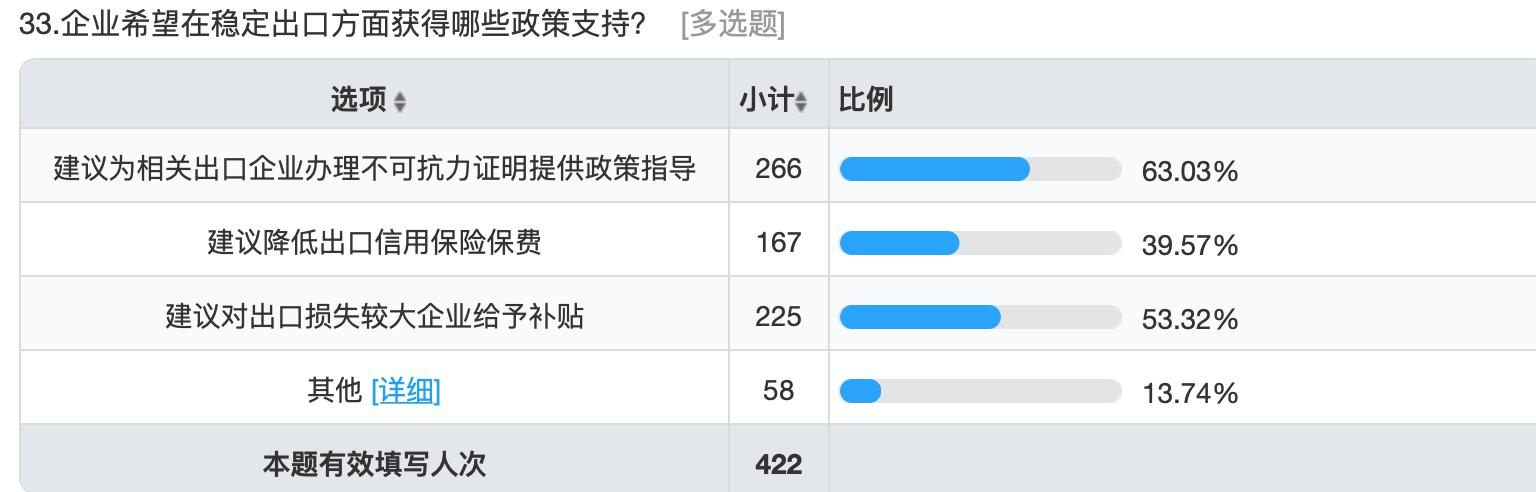 另外,此次疫情對企業后續發展的影響主要還體現在:訂單延期交付(329 份,77.96%);意向訂單減少(247 份,58.53%);企業用工困難(228 份,54.03%);產品出口受阻(155 份,36.73%)。