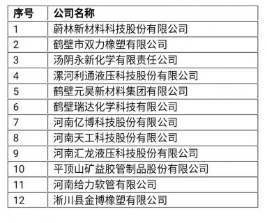 蔚林股份、鶴壁雙力、湯陰永新、匯龍液壓等12家橡膠行業企業進入該名單。